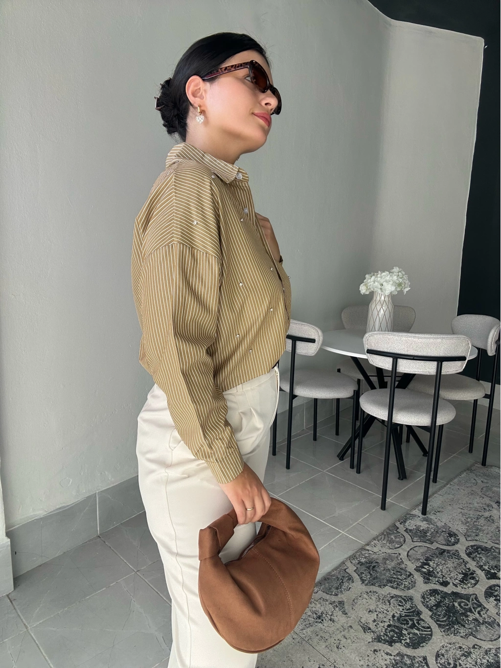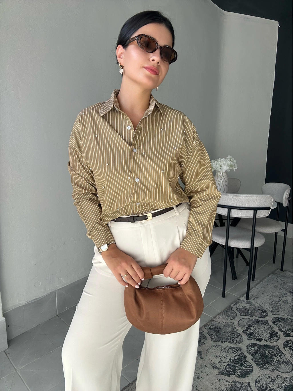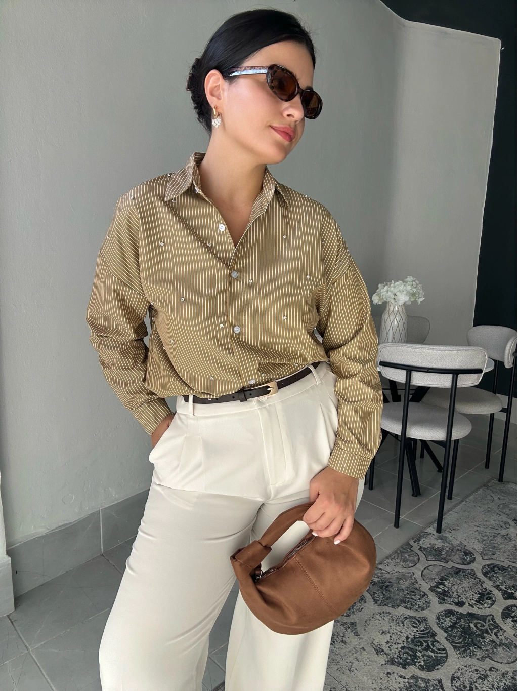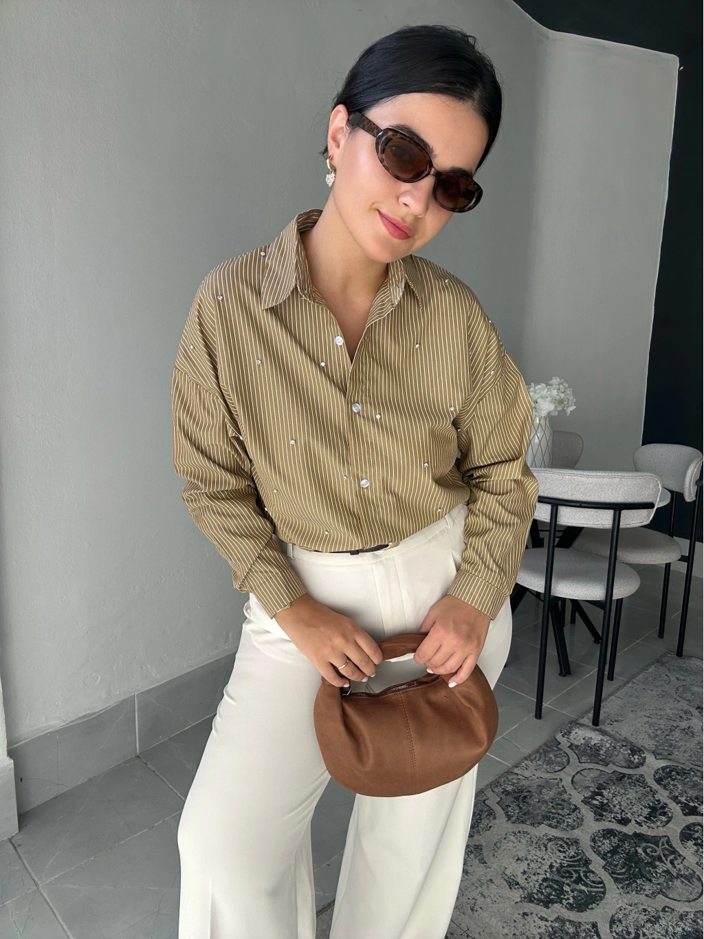 Çizgili Taşlı Gömlek. Salaş bir kalıbı vardır. Kalça boyu uzunluğundadır.