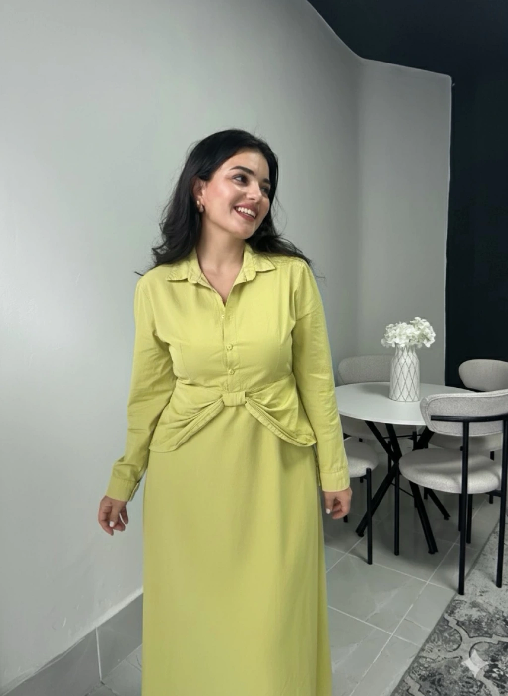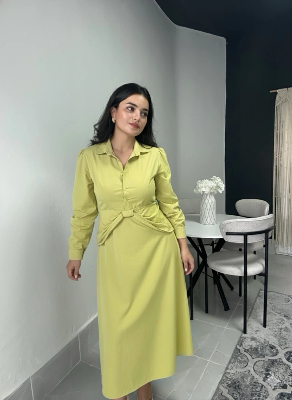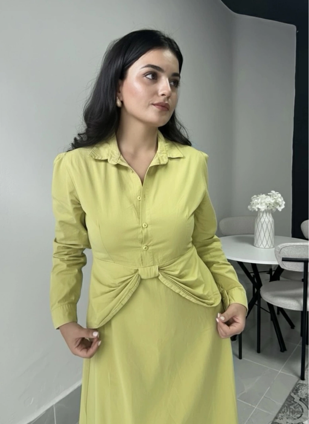Gömlek yaka yağ yeşili midi boy elbise. Keten kumaş karışımlıdır. Manken ölçüleri 168 cm 72 kg olup çekimlerde M beden ürün kullanılmıştır. Elbise boyu 110 cmdir.