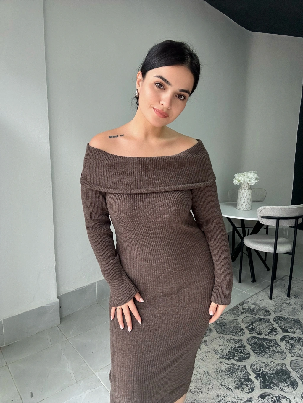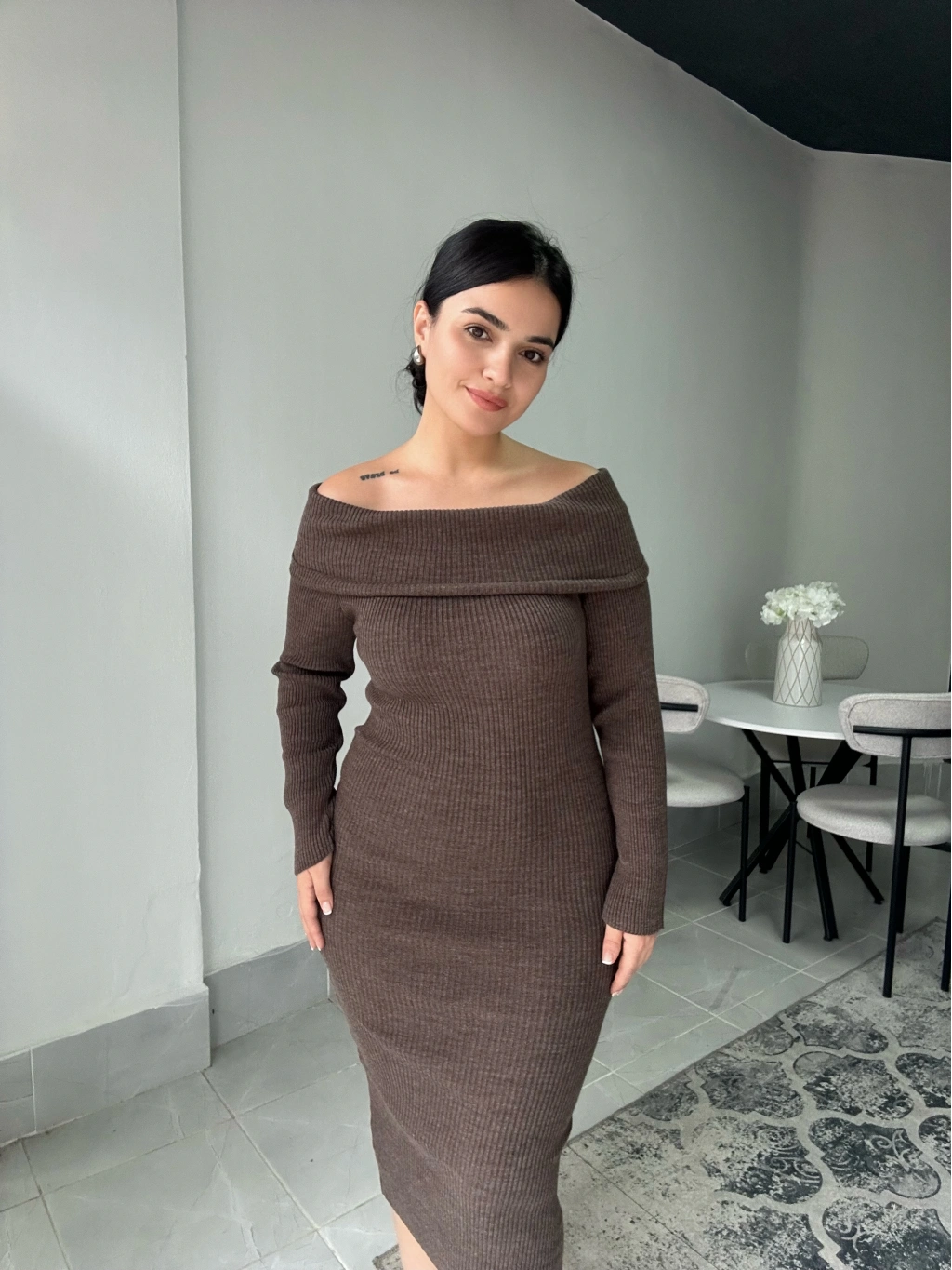 Madonna Yaka Kahverengi Triko Elbise . Esnek kumaş Standart bedendir 44 bedene 85-90 kgye kadar uygundur. Elbise boyu 115 cmdir. Manken ölçüleri 168 cm boy 73 kg.