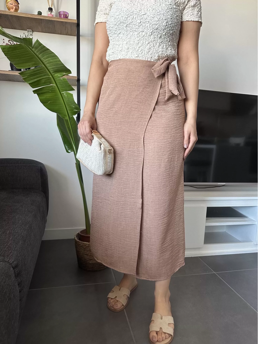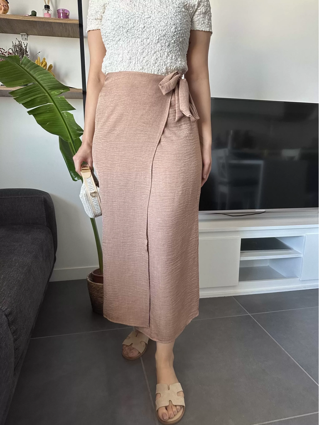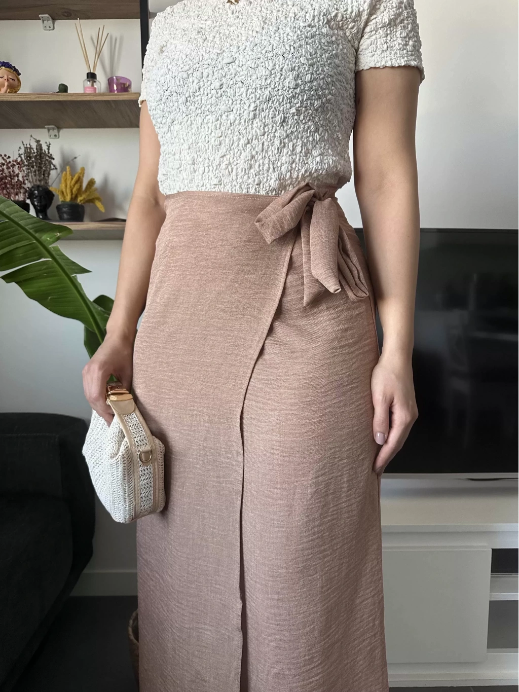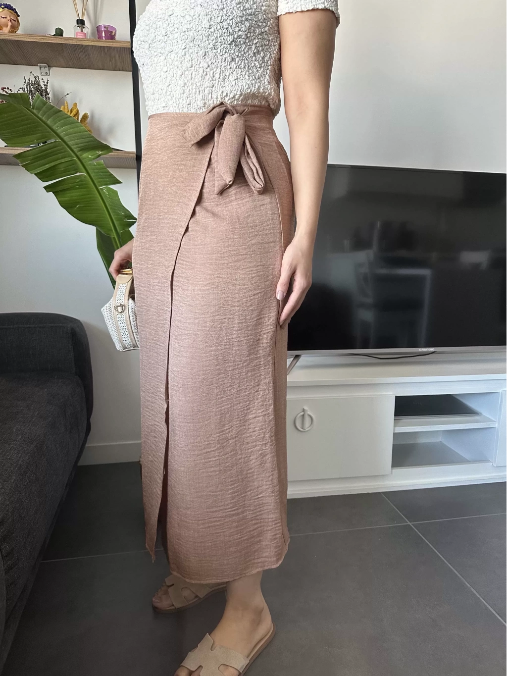 Yandan Bağlamalı Kahverengi Keten Etek. Çapraz kesimlidir. Bilek boy olup tam kalıptır. Manken ölçüleri 70 kg 170cm için L beden ürün tercih edilmiştir.